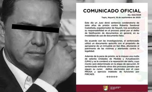 El exgobernador de Nayarit, Roberto Sandoval, fue sentenciado a 7 años de prisión por usar un documento falso para apropiarse ilegalmente de un inmueble en San Blas.