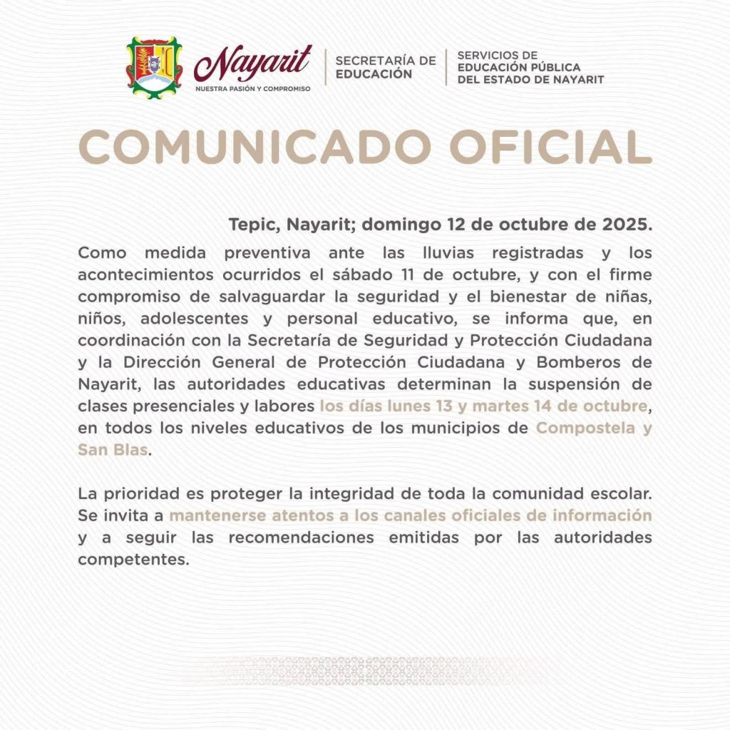 Tepic, Nayarit, 12 de octubre de 2025 — La Secretaría de Educación del Estado de Nayarit anunció la suspensión de clases presenciales y labores educativas los días lunes 13 y martes 14 de octubre en todos los niveles escolares de los municipios de Compostela y San Blas, como medida preventiva ante las lluvias registradas y los eventos ocurridos el sábado 11.